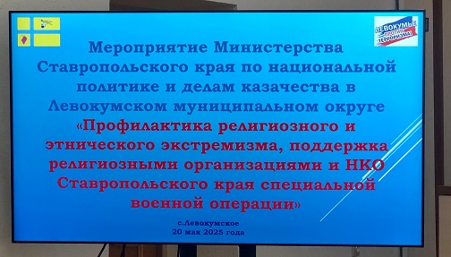 20 мая 2025 года в администрации Левокумского муниципального округа Ставропольского края состоялось значимое мероприятие, организованное Министерством Ставропольского края по национальной политике и делам казачества при активном участии Духовного управления мусульман Ставропольского края и Представительства Республики Дагестан в Ставропольском крае. Тема встречи была обозначена как «Профилактика религиозного и этнического экстремизма, поддержка религиозным организациями и НКО Ставропольского края специальной военной операции».